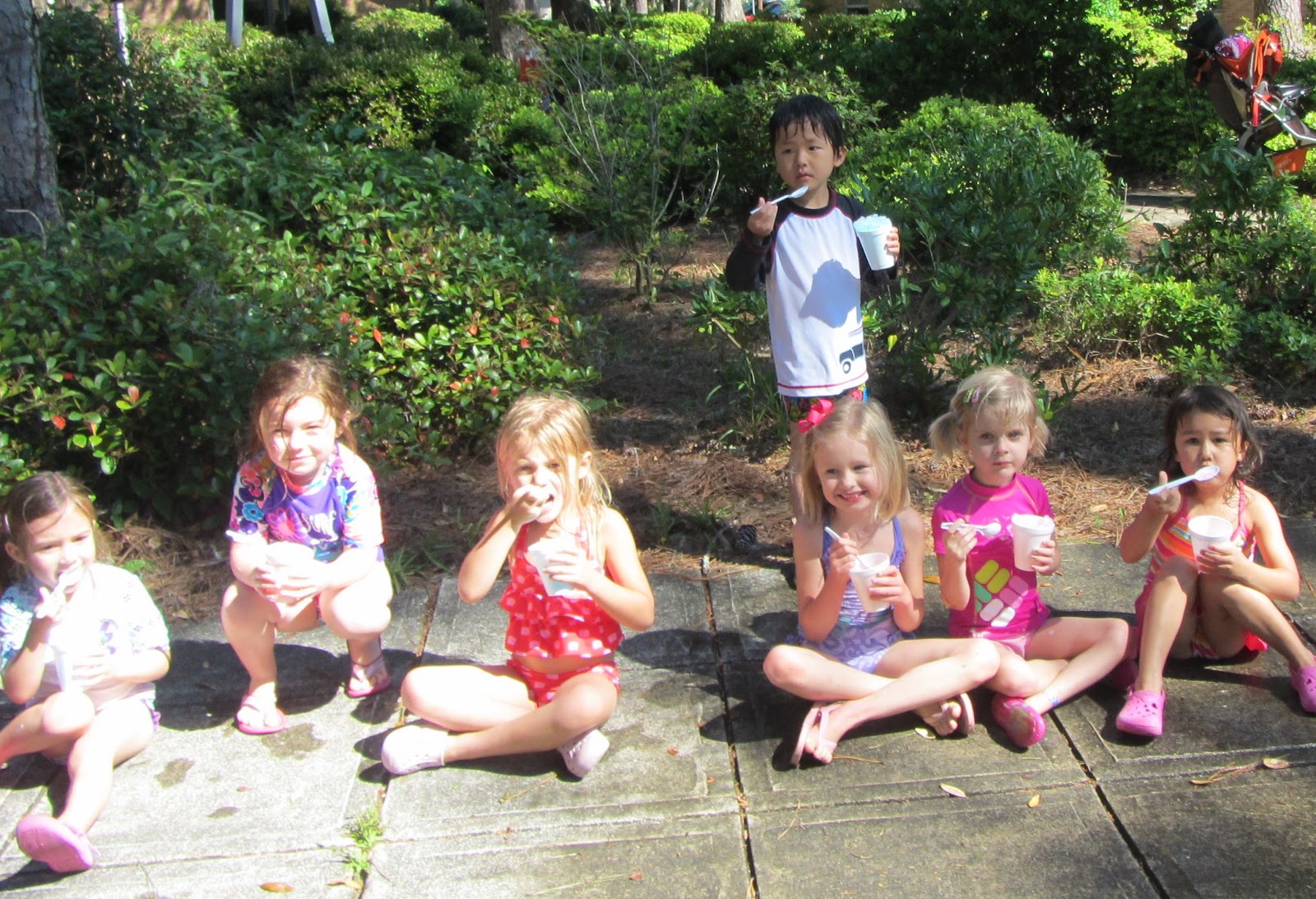 We celebrated some almost birthdays in class this month for those of us with summer birthdays! Last week, Ms. Heather celebrated not turning 40 yet with yummy brownies and muffins, a beautiful painted balloon bouquet and birthday surprise from the whole class. Then today, we celebrated our friends who are almost 5 and 6 with cupcakes and juice picnic style in the garden!