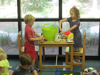 Every morning, 2 toys are "open" on the rug. Today, we had kitchen and cars/ trucks. It was great to see old friends, make new friends, and check out our new classroom together!