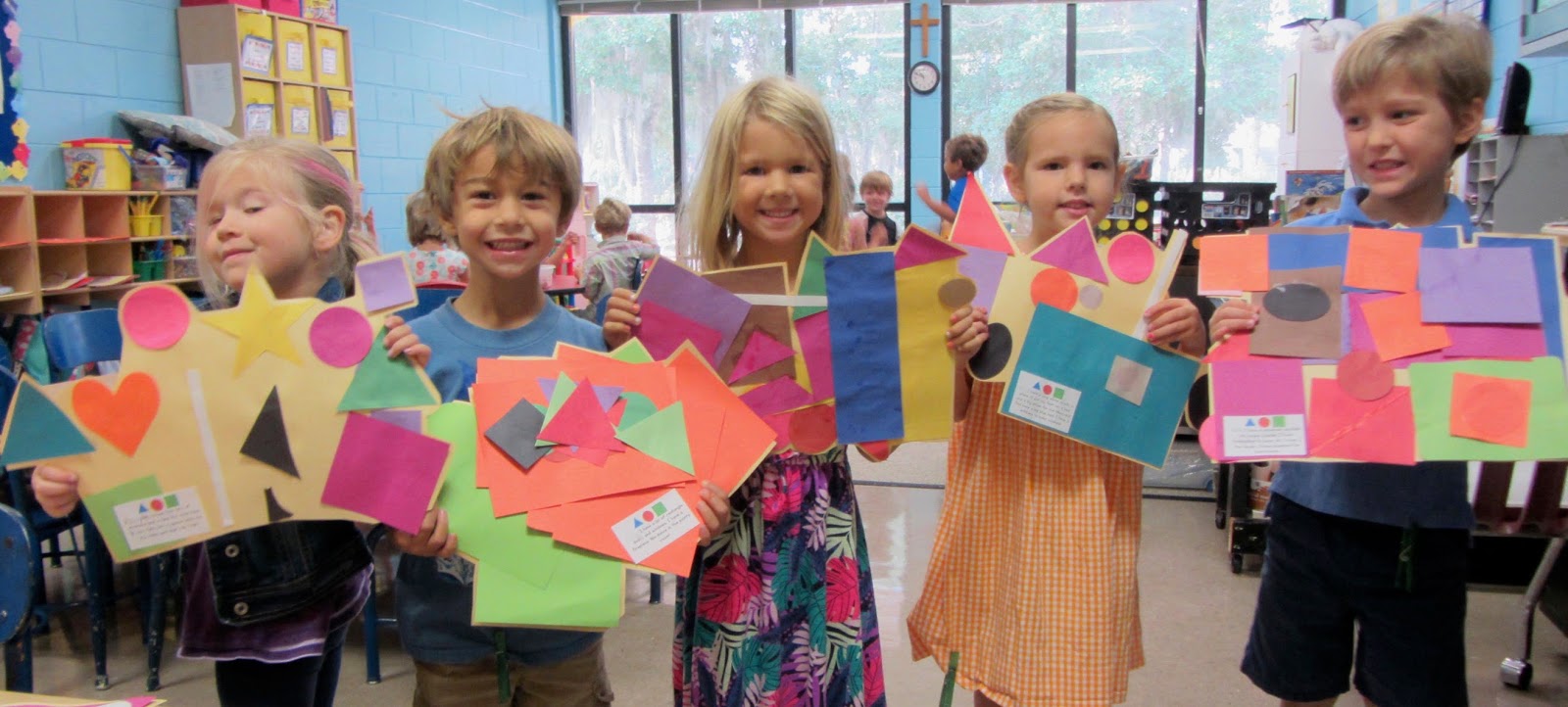 Another wonderful book to check out is If I Built a House. It takes us through an imaginary house that has unique rooms- slides, rockets, car wash showers, etc. We used a wide variety of shape cut outs to design fun houses. The best part for me as a teacher was having each child tell me their favorite things about their creation. They have so many wonderful ideas! When a grown up takes the time to listen to their words, writes them down carefully, and reads them back to double check that we got everything they said, it shows the kids that what they think is interesting and important. It also naturally reinforces how writing helps us share ideas with others- and we have a lot to say!
